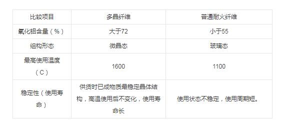 多晶莫來石散棉是由高熔點(diǎn)金屬氧化物微晶體組構(gòu)成的纖維,它與普通耐火纖維(玻璃纖維、礦棉、硅酸鋁纖維、高鋁纖維)的主要區(qū)別見表: